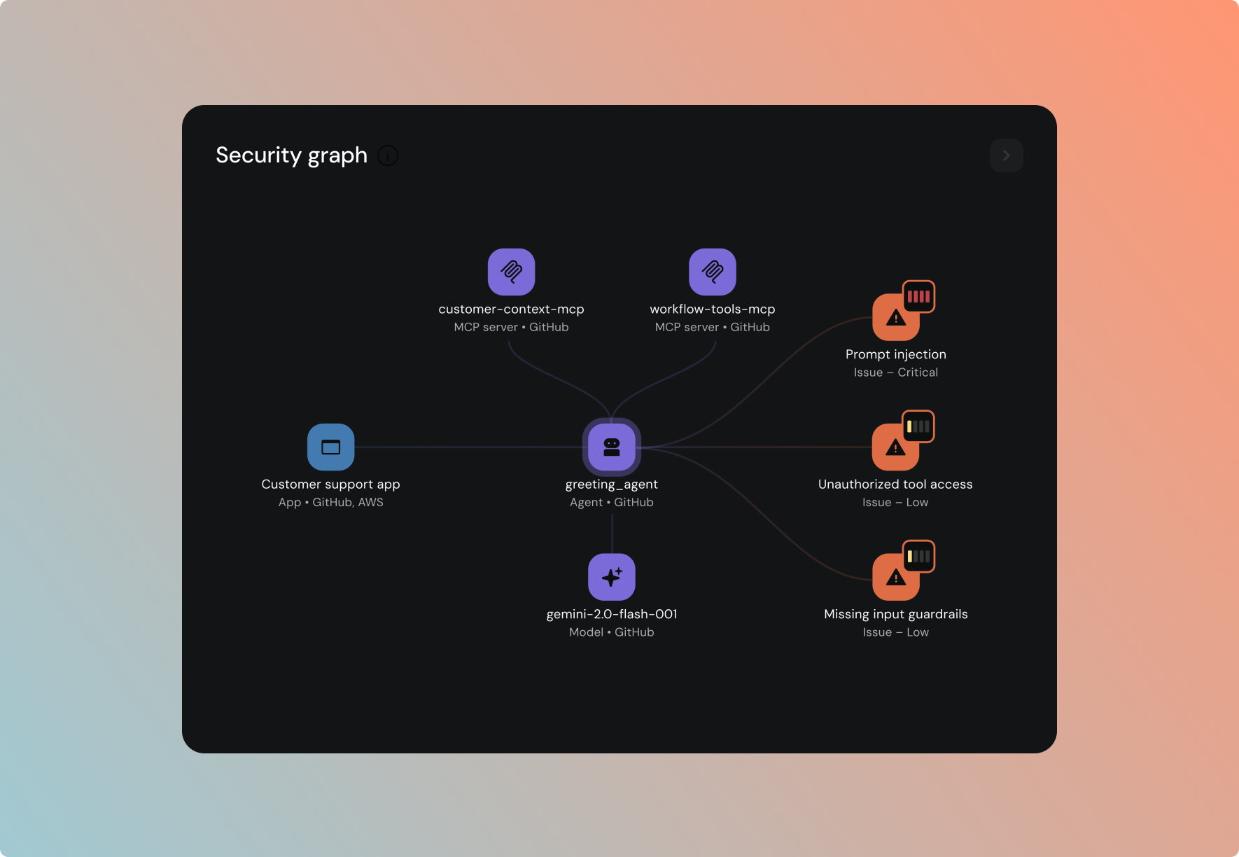Models, agents, and MCP servers in your codebase, cloud, and production infrastructure. Application, cloud, network, endpoint, and memory sensors detect every asset and enrich it with full risk context.