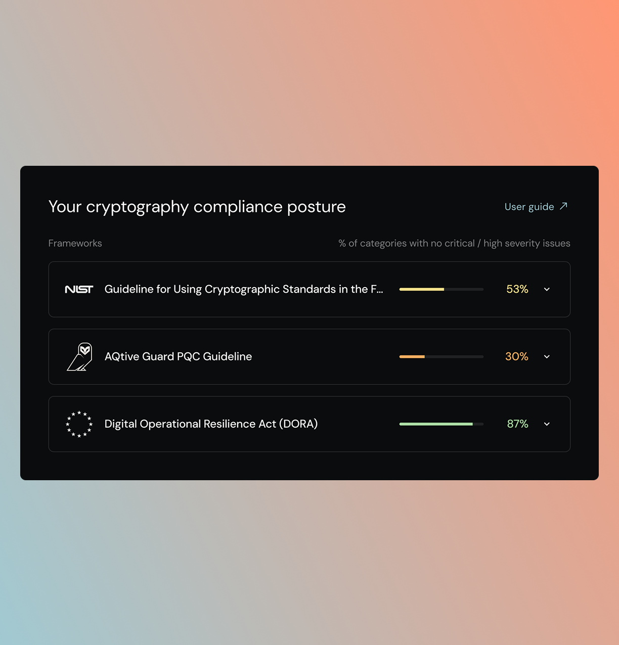 Compliance deadlines for CNSA 2.0, NIST, and federal PQC mandates are already here. AQtive Guard discovers every key, certificate, and cryptographic operation across your infrastructure, so you can remediate risk and address compliance obligations to auditors and boards.
